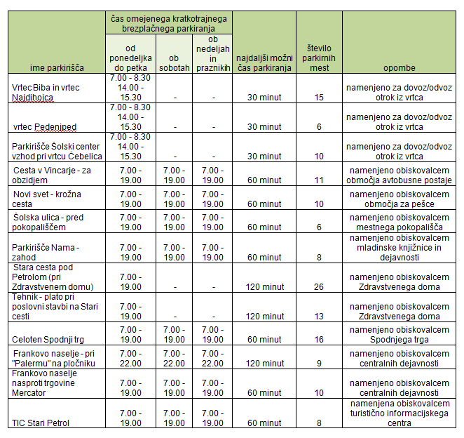 Cena in čas parkiranja na posameznih plačljivih parkiriščih: