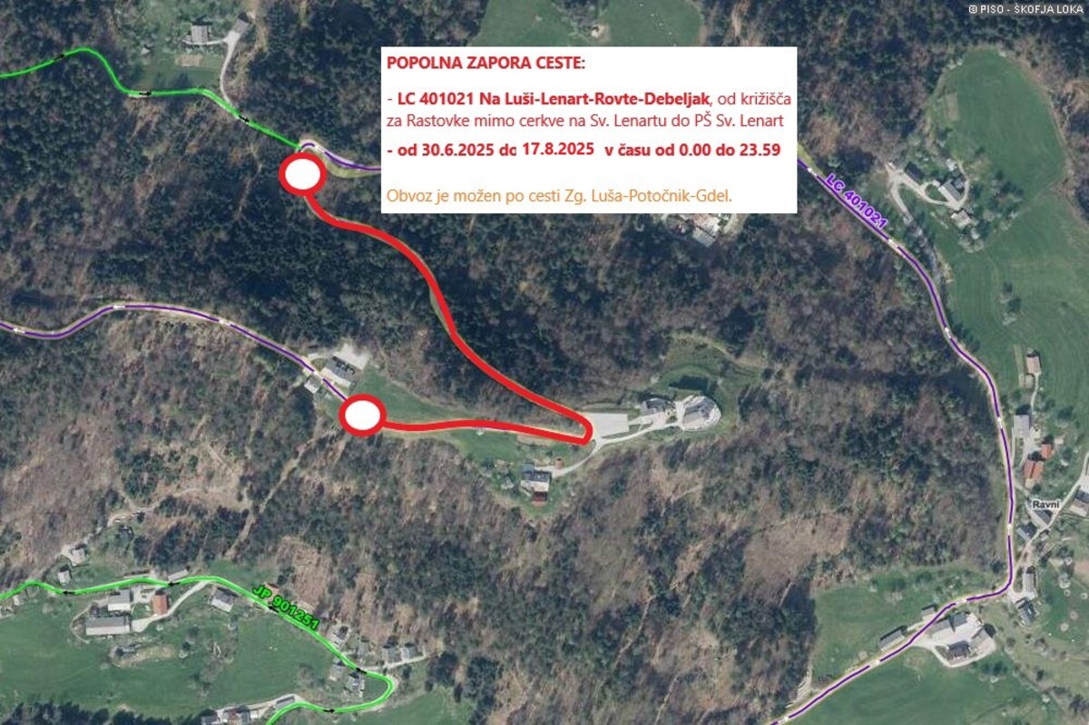 Zaradi rekonstrukcije bo cesta (LC 401021) »Na Luši–Lenart–Rovte–Debeljak«, od križišča za Rastovke mimo cerkve na Sv. Lenartu do podružnične šole Sv. Lenart, popolnoma zaprta do nedelje, 17. avgusta 2025.