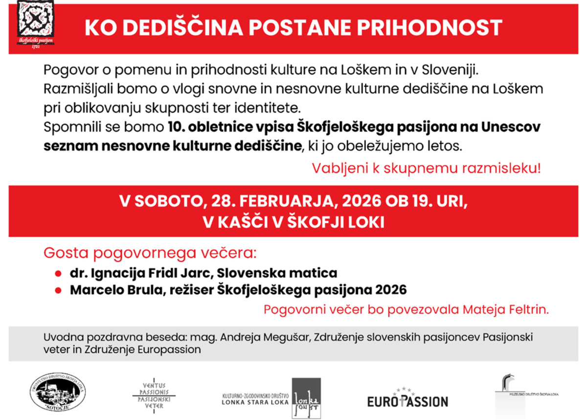 V soboto, 28. februarja 2026, ob 19. uri bo v Kašči v Škofji Loki pogovorni večer o pomenu in prihodnosti kulture na Loškem in v Sloveniji. Dogodek bo posvečen 10-letnici vpisa Škofjeloškega pasijona na UNESCO-v Reprezentativni seznam nesnovne kulturne dediščine človeštva.