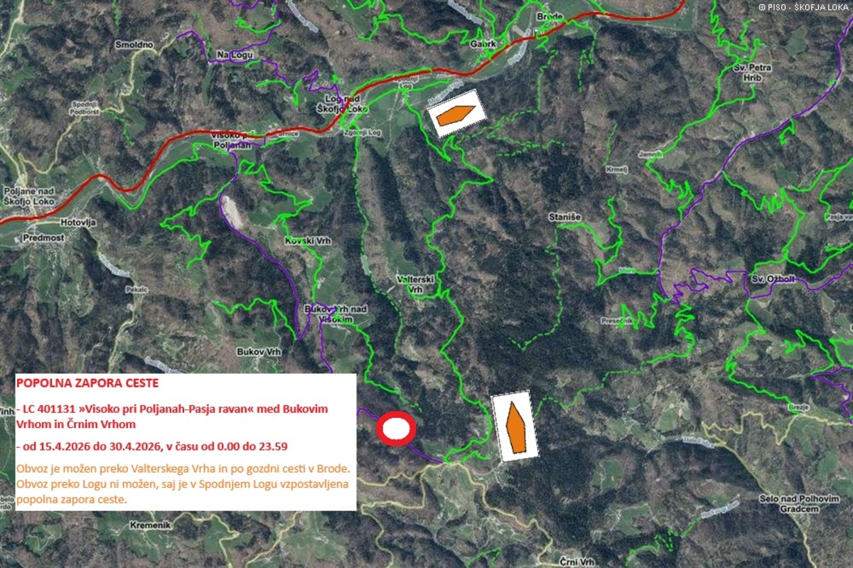 Zaradi sanacije plazu bo cesta (LC 401131) »Visoko pri Poljanah–Pasja ravan«, med Bukovim Vrhom in Črnim Vrhom, popolnoma zaprta, od 15. aprila 2026 do 30. aprila 2026.
