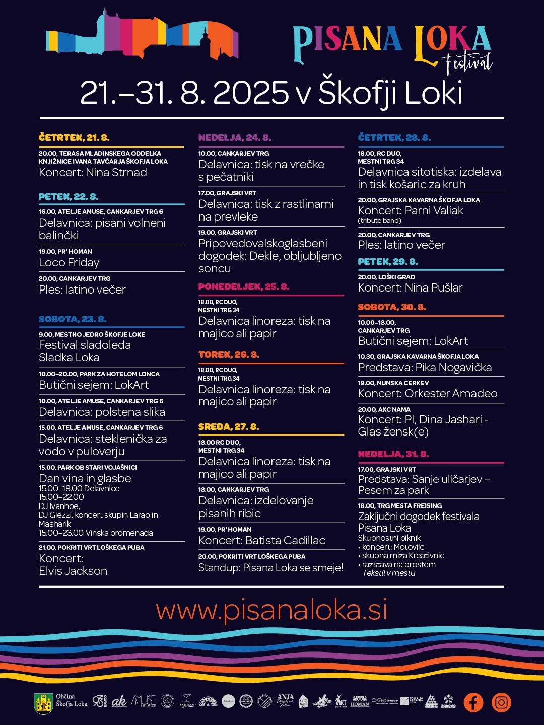 Pisana Loka bo znova oživljala ulice in trge Škofje Loke. Letošnji festival bo tudi letos popestril poletne dneve v Škofji Loki – potekal bo od 21. do 31. avgusta, z več kot 25 dogodki, ki združujejo umetnost, glasbo, ustvarjalnost in zabavo za vse generacije.