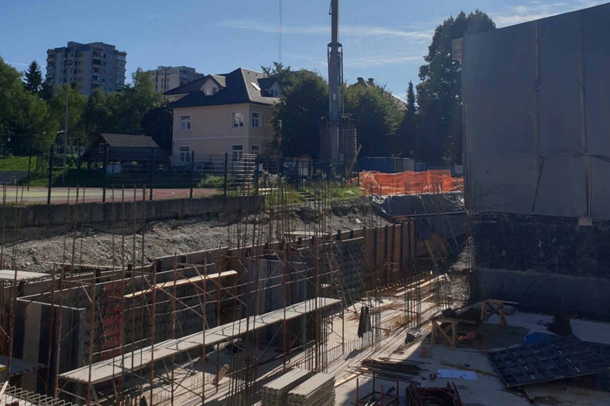 Trenutno intenzivno poteka betoniranje temeljne plošče in sten pod nivojem terena.