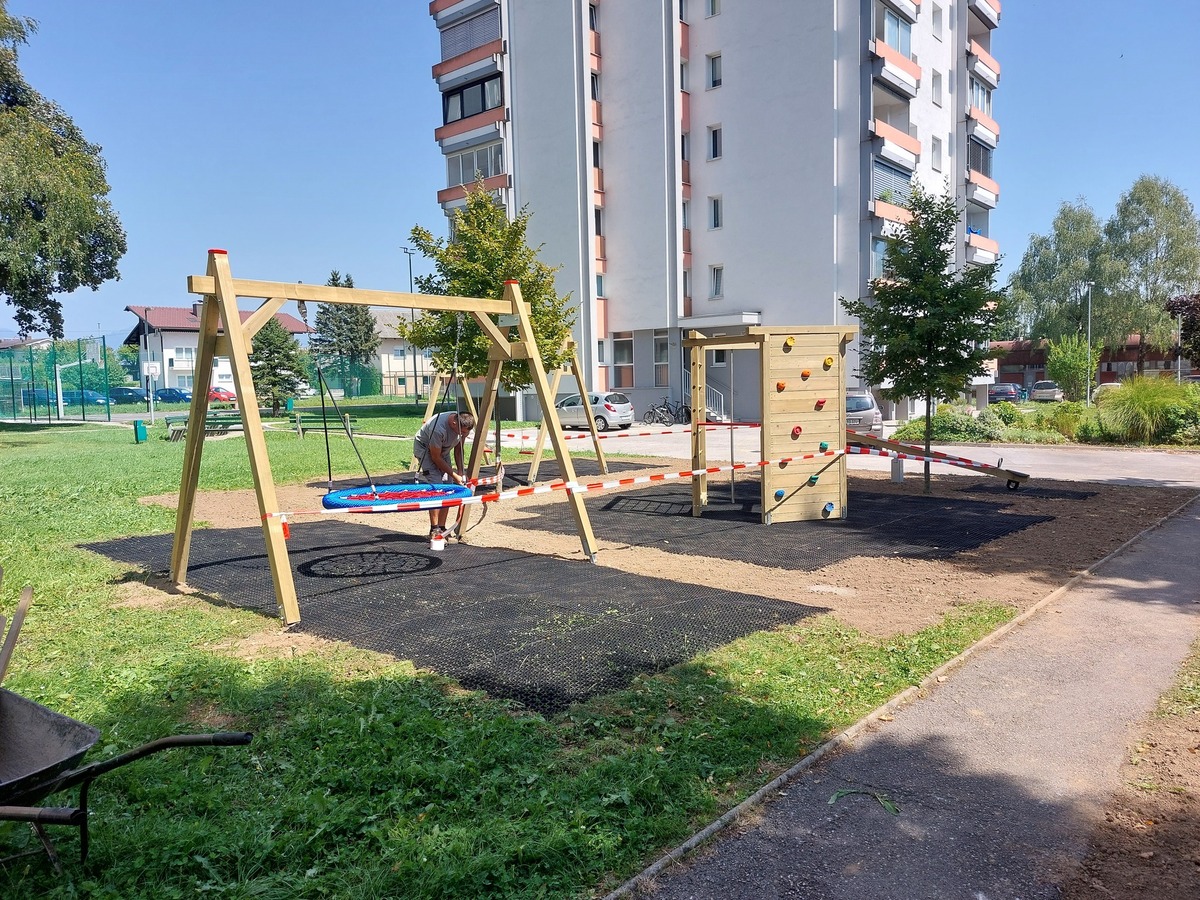Prejšnji teden so izvajalci dokončali postavitev vseh igral in varovalne podlage novega javnega otroškega igrišča - Podlubnik.