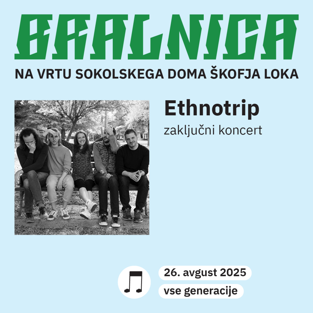 Skupaj bomo preskočili prag jeseni in se srečali ob zvokih prekmurske skupine Ethnotrip, ki prihaja iz Lendave in nas bo popeljala v prijeten večer. Skupina se navdušuje nad ljudskim izročilom, kar pokaže na prvih dveh zgoščenkah »Ethnotrip« (Samozaložba, 2013) in »Kdo bo pil iz bistrega studenca« (Celinka, 2016). Že to, da zasedba ni tipično ljudska, nam da vedeti, da so priredbe teh pesmi drugačne. Tradicije se lotevajo »z radovednostjo in invencijo, ne da bi pri tem pozabila na žar in čustva.«
