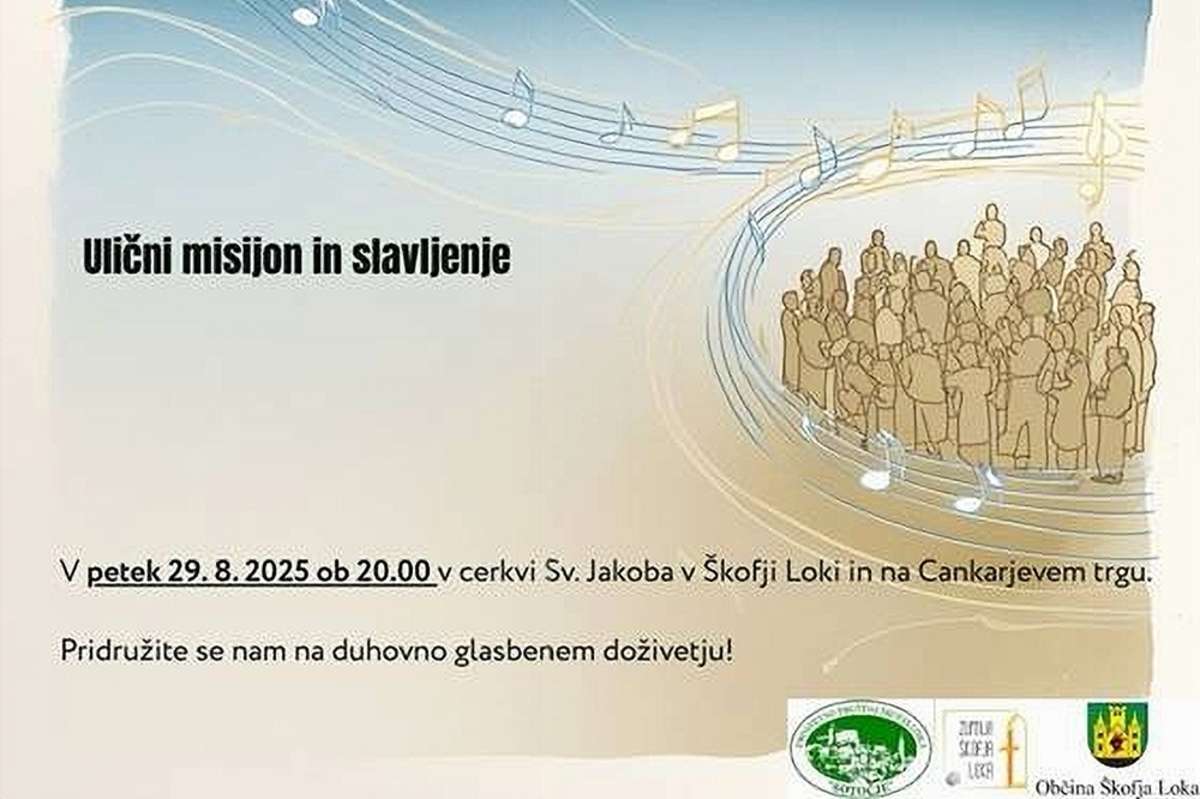 V petek, 29. avgusta 2025, ob 20. uri bo duhovno glasbeno doživetje, ki se bo začelo s sveto mašo v cerkvi sv. Jakoba v Škofji Loki, nato pa nadaljevalo na Cankarjevem trgu pred cerkvijo.
