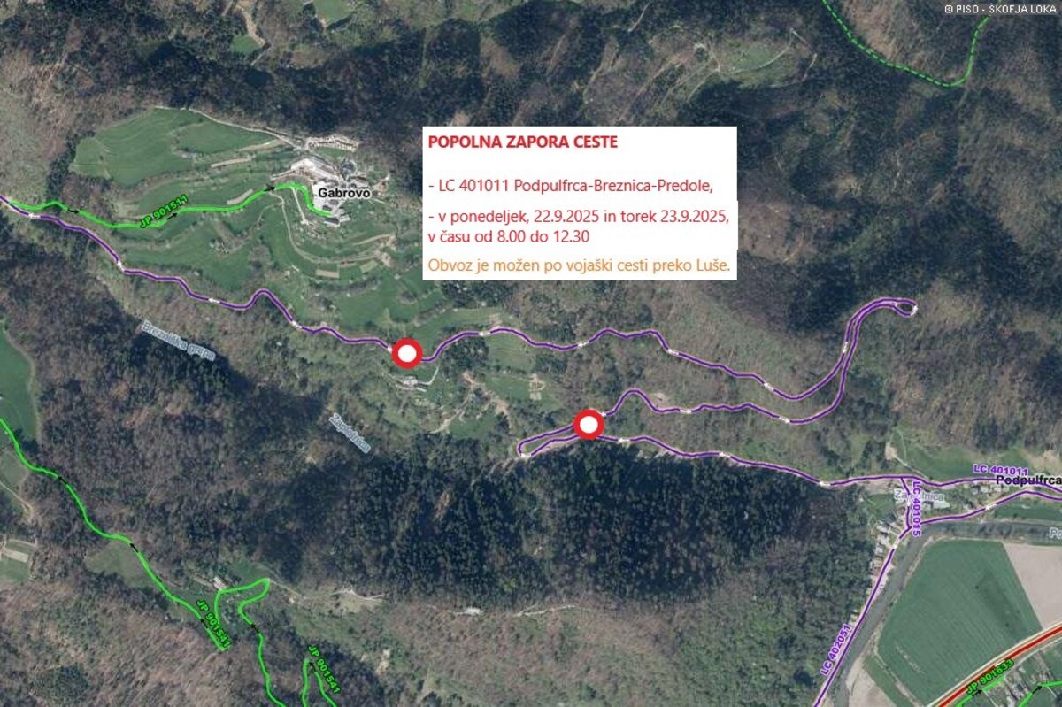 Obveščamo vas o kratkotrajni popolni zapori ceste Podpulfrca-Breznica pod Gabrovim. Prosimo za razumevanje.