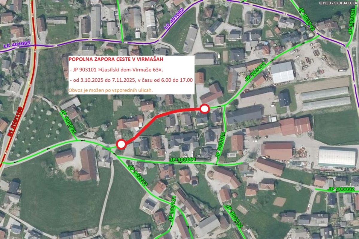 Obveščamo vas o popolni zapori ceste v Virmašah. Prosimo za razumevanje.