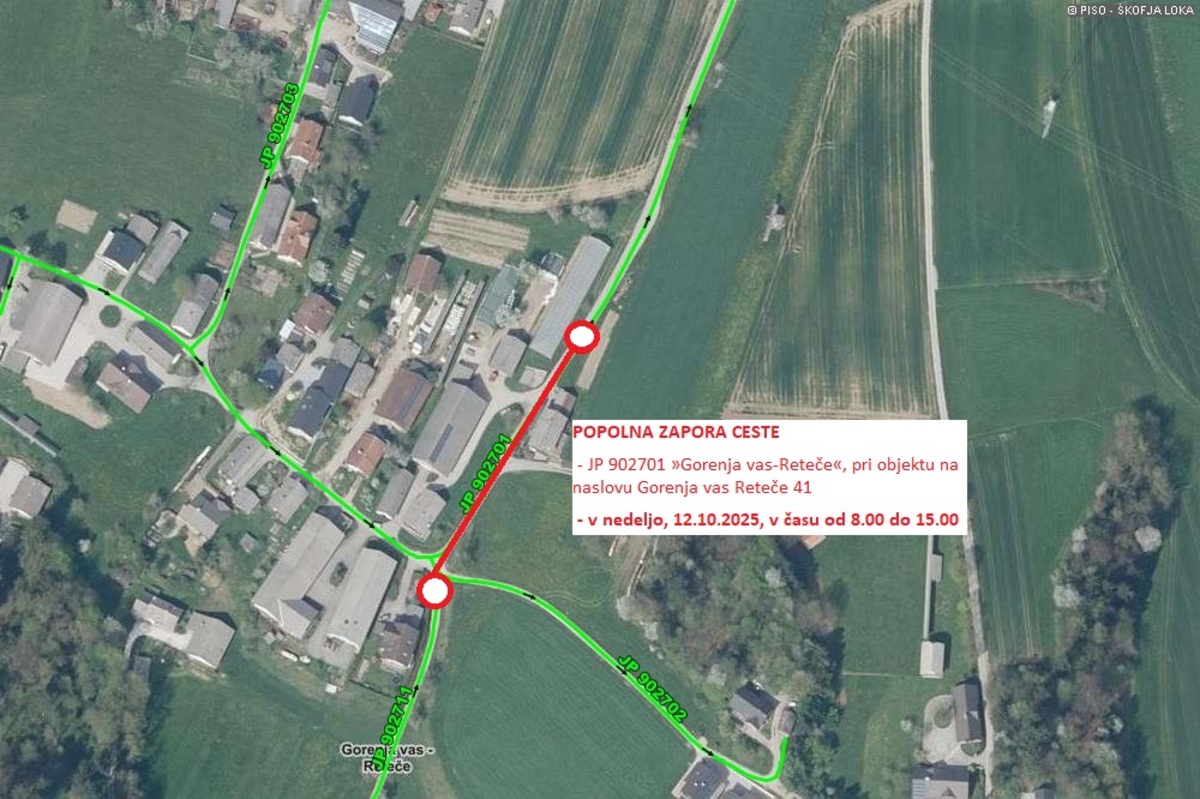 Zaradi asfaltiranja bo cesta (JP 902701) »Gorenja vas–Reteče«, pri objektu na naslovu Gorenja vas Reteče 41, popolnoma zaprta v nedeljo, 12. oktobra 2025, v času od 8. do 15. ure.