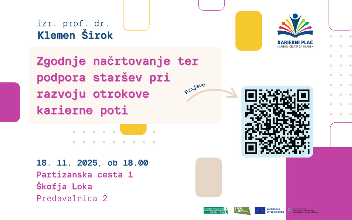 V okviru Kariernega placa - Kariernega centra za mlade+ vas vabimo na brezplačno predavanje izr. prof. dr. Klemna Široka: Zgodnje načrtovanje ter podpora staršev pri razvoju otrokove karierne poti.