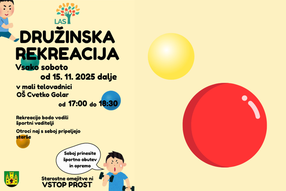 V soboto, 15. novembra 2025, se v mali telovadnici OŠ Cvetko Golar začne nova sezona družinske rekreacije. Vabljene so družine oziroma družinski člani vseh starosti, saj starostnih omejitev ni. Vstop je prost, vadbo pa vodijo športni vaditelji.
