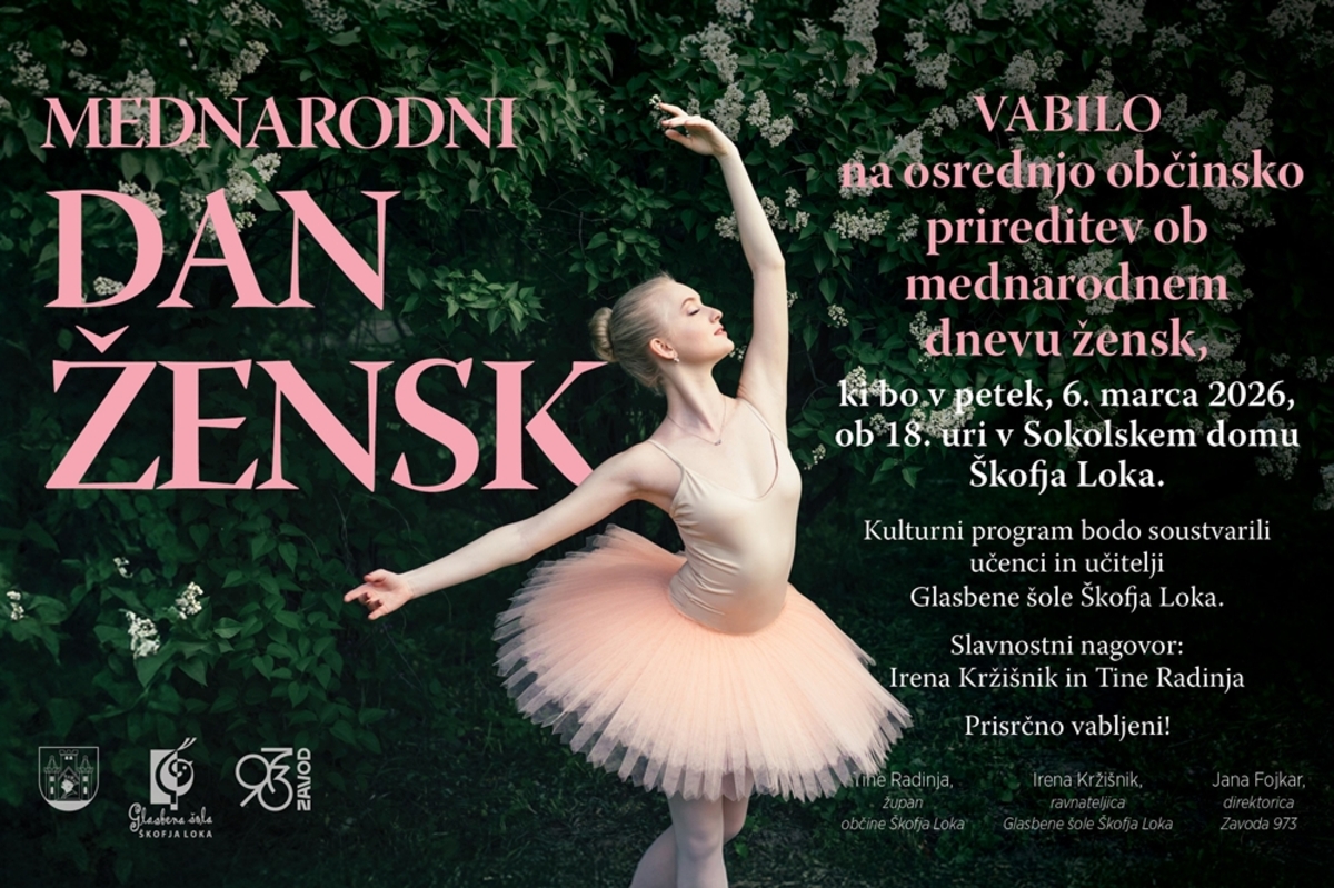 V petek, 6. marca 2026, bo ob 18. uri v Sokolskem domu Škofja Loka potekala osrednja občinska prireditev ob mednarodnem dnevu žensk. Dogodek pripravljamo Občina Škofja Loka, Glasbena šola Škofja Loka in Zavod 973. Ob mednarodnem dnevu žensk bo večer posvečen spoštovanju, ustvarjalnosti in povezovanju.