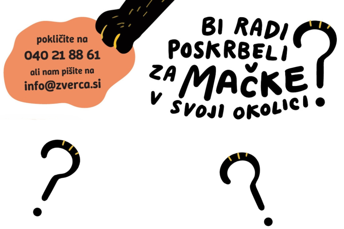 Vsi, ki bi želeli pomagati pri skrbi za mačke v svoji okolici ali opazijo lokacije z večjim številom neoskrbljenih mačk, lahko stopijo v stik z društvom Zavod Zverca: 040 21 88 61 ali info@zverca.si.