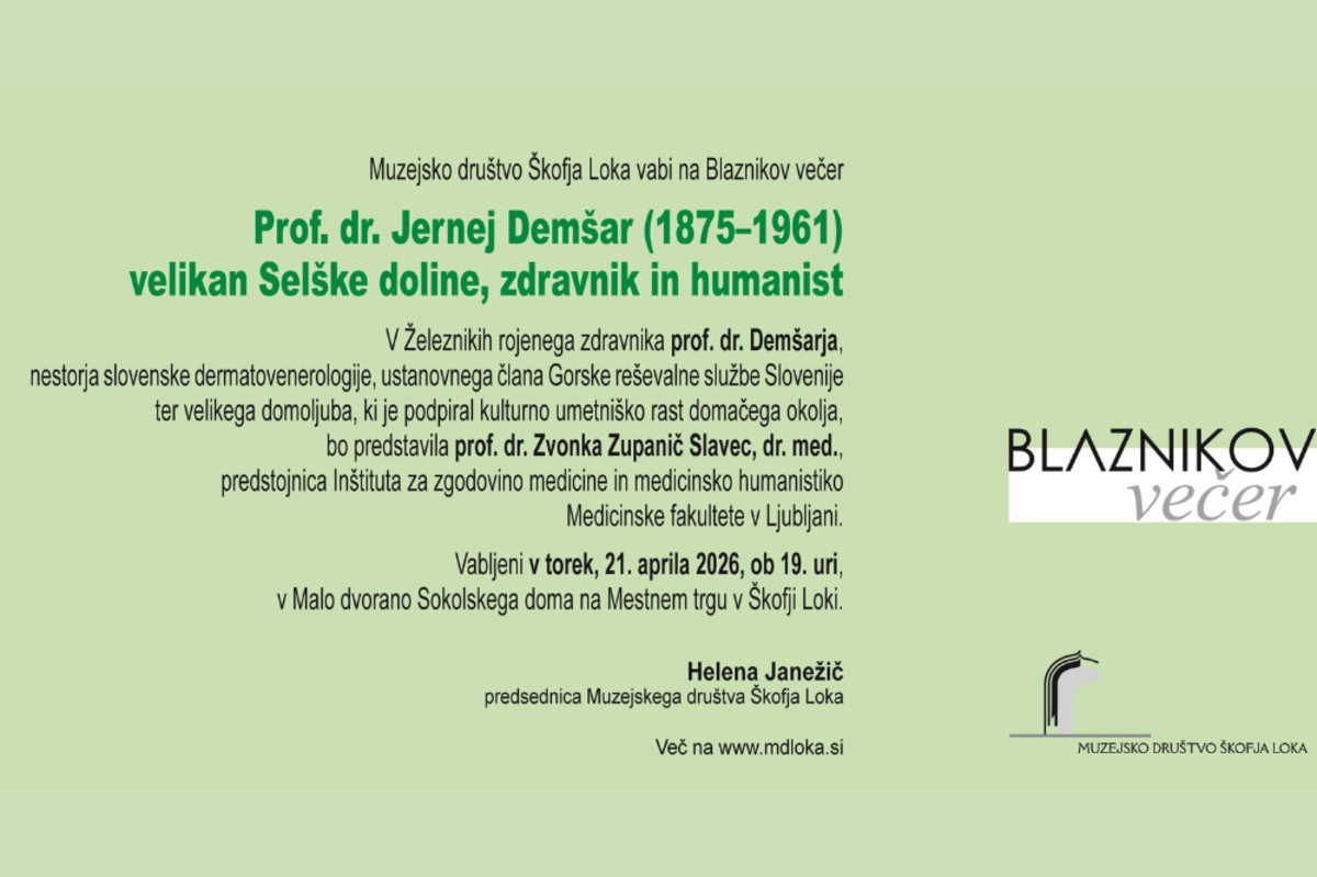 Muzejsko društvo Škofja Loka pripravlja Blaznikov večer, posvečen prof. dr. Jerneju Demšarju, pomembnemu zdravniku in humanistu iz Selške doline. Dogodek osvetljuje njegovo bogato življenjsko pot ter prispevek k razvoju medicine in širšega družbenega prostora.