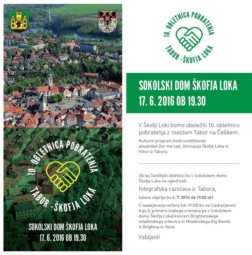 Vabimo vas na slovesnost ob 10. Obletnici pobratenja med češkim mestom Tabor in Škofjo Loko, ki bo v petek, 17.6.2016 ob 19.30 uri v Sokolskem domu v Škofji Loki.