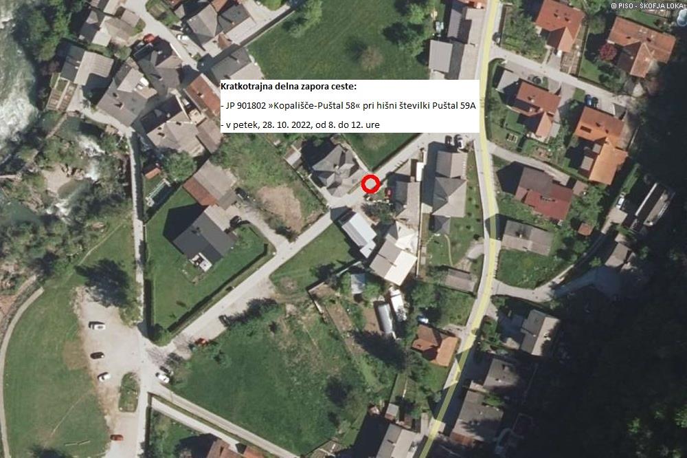 Na cesti (JP 901802) »Kopališče-Puštal 58« pri hišni številki Puštal 59 bo v petek, 28. 10. 2022, v času od 8. do 12. ure kratkotrajna delna zapora.