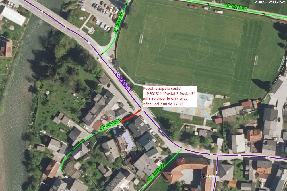 Zapora ceste v Puštalu (JP 901811) bo od 1. 12. 2022 do 5. 12. 2022 v času od 7. do 17. ure.