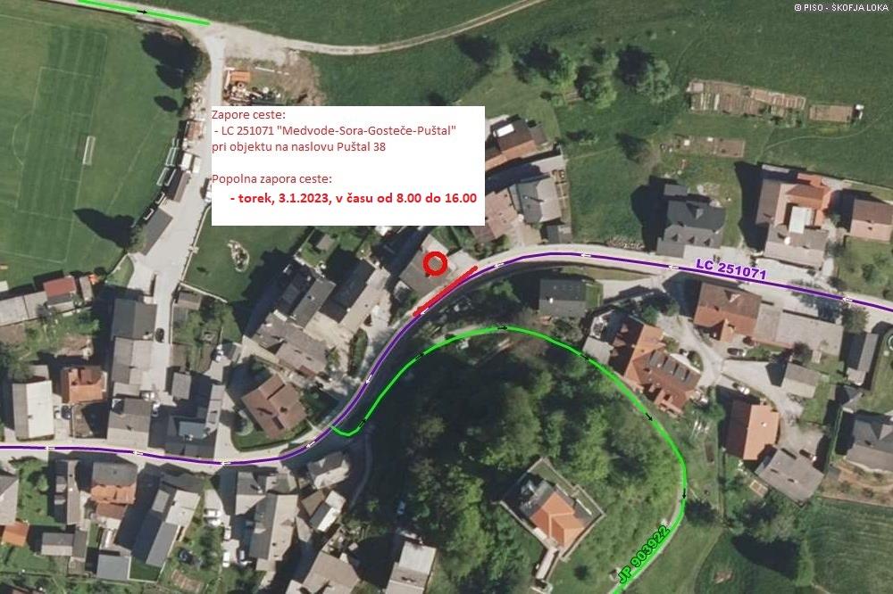 Cesta »Medvode-Sora-Gosteče-Puštal« bo pri hišni številki Puštal 38 zaradi postavitve ostrešja na tamkajšnjem objektu zaprta v torek, 3. 1. 2023, v času od 8. do 16. ure.