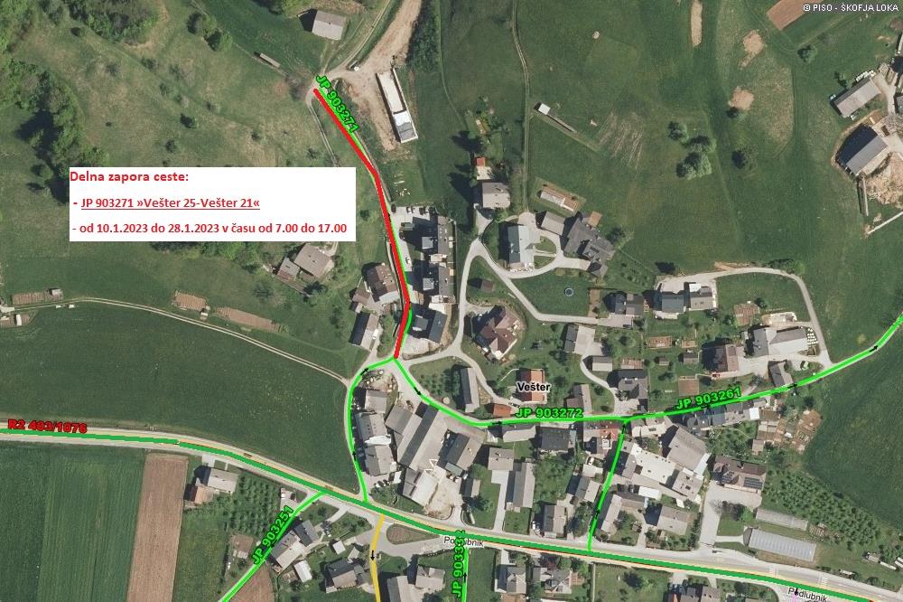Cesta (JP 90327) »Vešter 25-Vešter 21« bo zaradi izvedbe priključka na vodovod in kanalizacijo delno zaprta od 10. 1. 2023 do 28. 1. 2023 v času od 7. do 17. ure.
