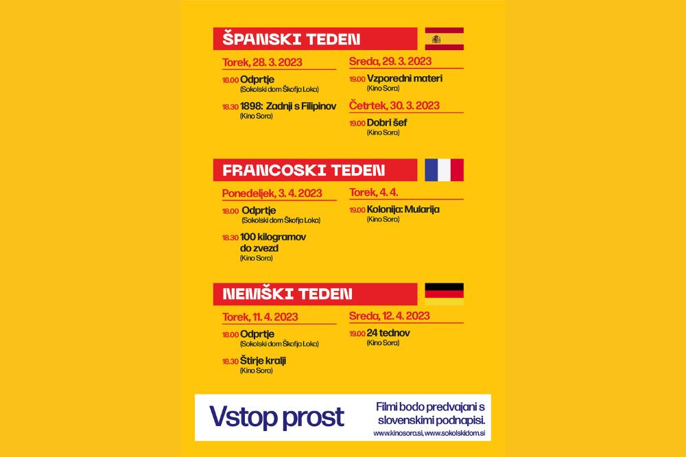 Približuje se Mesec evropskega filma, ki bo od torka, 28. marca do srede, 12. aprila 2023, potekal v Kinu Sora in Sokolskem domu Škofja Loka. Vsi filmi bodo predvajani s slovenskimi podnapisi. Vstop na vse projekcije bo prost.