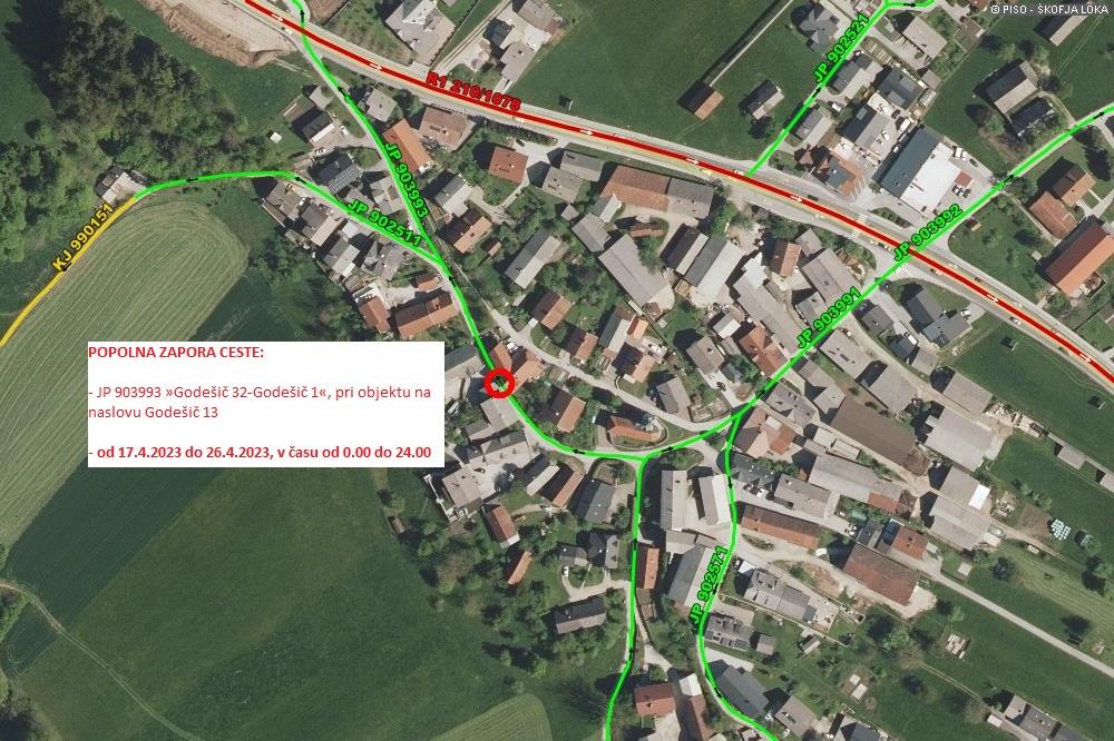 Cesta (JP 903993) »Godešič 32-Godešič 1« bo pri objektu na naslovu Godešič 13 v obdobju od 17. 4. 2023 do 26. 4. 2023 popolnoma zaprta.