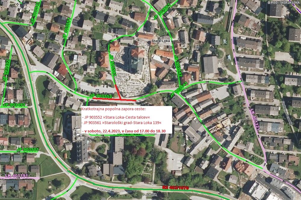 V soboto, 22. 4. 2023, v času od 17. do 18.30 ure bo popolna zapora cest (JP 903552) »Stara Loka-Cesta talcev« in (JP 903561) »Starološki grad-Stara Loka 139«.