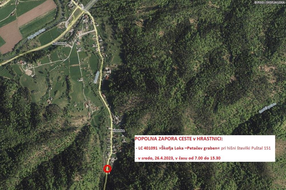 Cesta (LC 401091) »Škofja Loka–Petačev graben« bo pri hišni številki Puštal 151 v sredo, 26. 4. 2023, v času od 7. do 15.30 ure popolnoma zaprta.