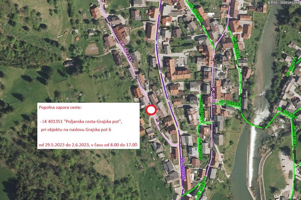 Cesta (LK 401351) »Poljanska cesta-Grajska pot« bi pri objektu na naslovu Grajska pot 6 zaprta od 29. 5. 2023 do 2. 6. 2023 v času od 8. do 17. ure.