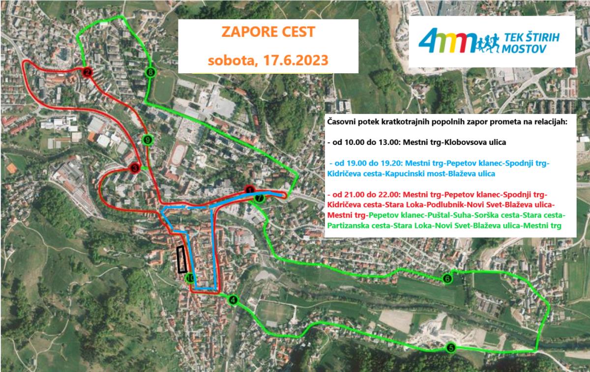 Zaradi prireditve Tek štirih mostov bodo v soboto, 17. junija, med 19. in 19.20 uro ter med 21. in 22. uro zaprte določene ceste v naši občini. Prosimo za razumevanje.