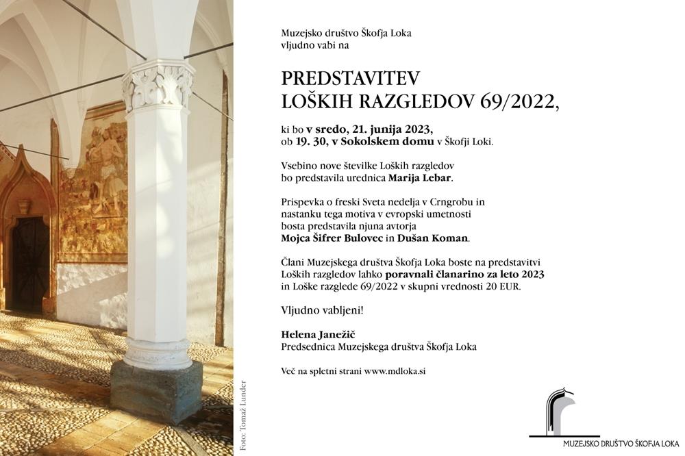 Muzejsko društvo Škofja Loka pripravlja predstavitev Loških razgledov 69/2022, ki bo v sredo, 21. junija 2023, ob 19. 30 v Sokolskem domu v Škofji Loki.