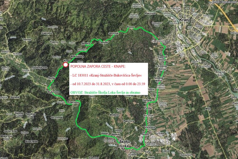 Zaradi rekonstrukcije ceste (LC 183011) »Kranj-Stražišče-Bukovščica-Ševlje« v Knapah bo le-ta od 10. 7. 2023 do 31. 8. 2023 zaprta.