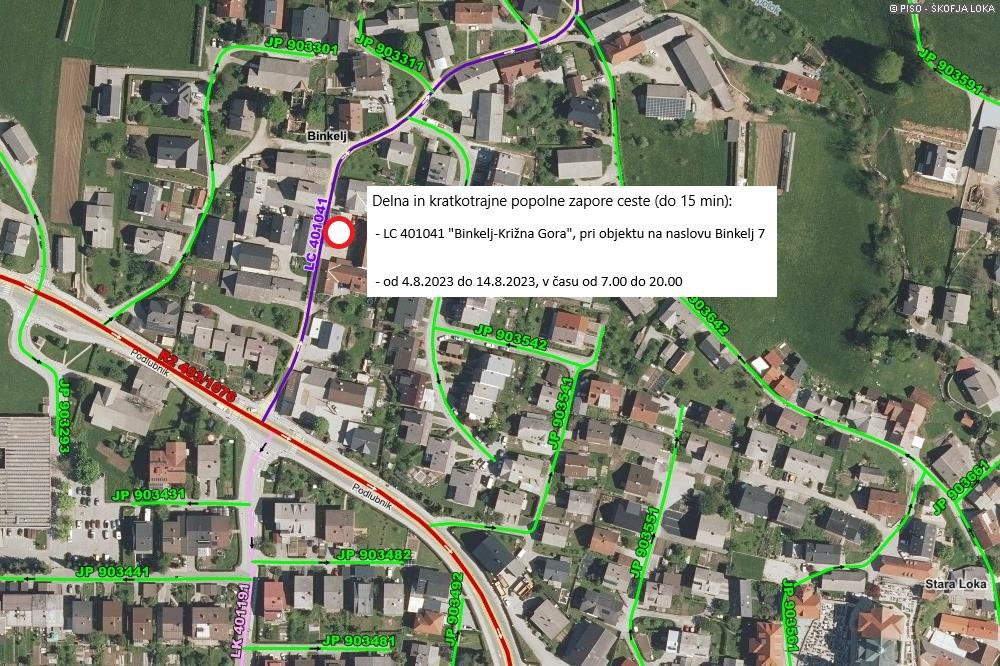 Zaradi obnove strehe bo cesta (LC 401041) »Binkelj-Križna Gora« pri objektu na naslovu Binkelj zaprta od 4. 8. 2023 do 14. 8. 2023 v času od 7. do 20. ure.