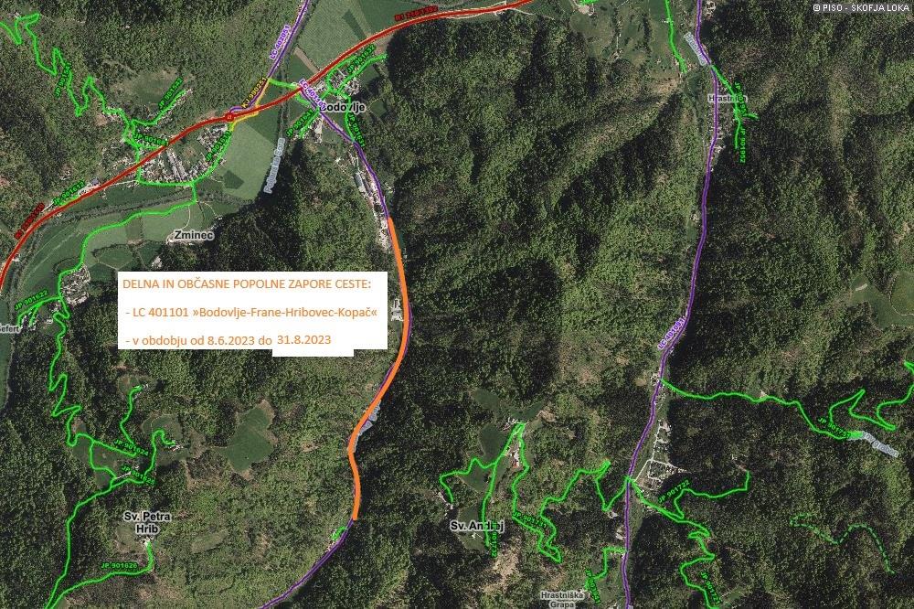 Cesta (LC 401101) »Bodovlje-Frane-Hribovec-Kopač« bo delno zaprta do 31. 8. 2023.