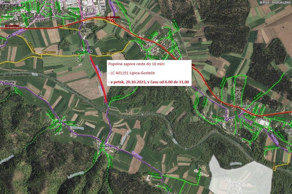 Cesta (LC 401151) »Lipica-Gosteče« bo v petek, 20. 10. 2023, v času od 6. do 11. ure kratkotrajno popolnoma zaprta.
