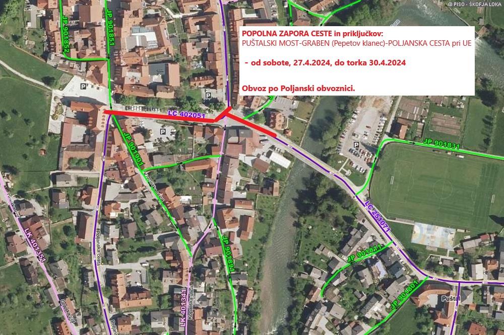 Obveščamo vas o popolni zapori od Puštalskega mostu po Grabnu do Upravne enote Škofja Loka (na vrhu Pepetovega klanca) in pripadajočih priključkov od sobote, 27. aprila 2024, do torka 30. aprila 2024. Prosimo za razumevanje.